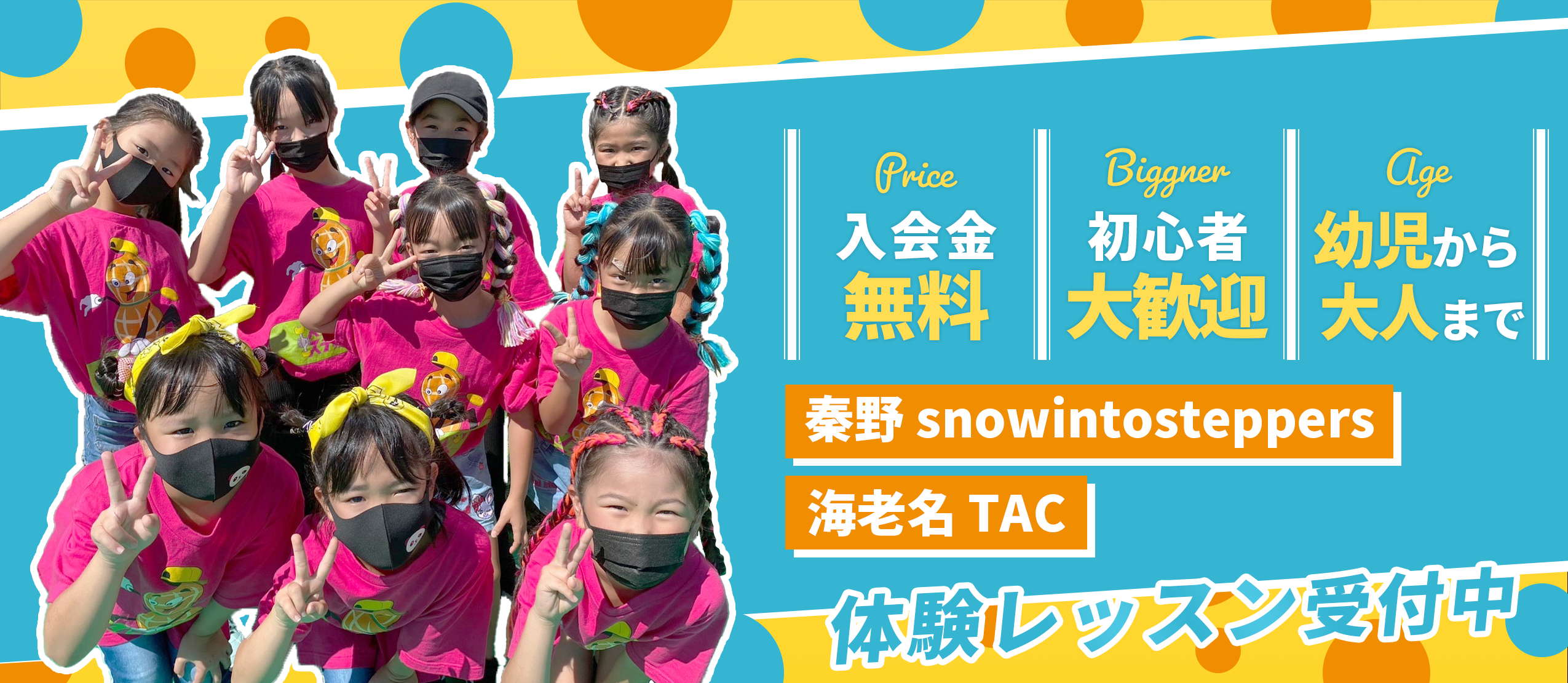 snowintosteppersとTACは、神奈川県秦野市と海老名市を拠点として活動しているダンスサークルです。各地域で年齢別の学年別・ジャンル別のダンスレッスンがあります。
